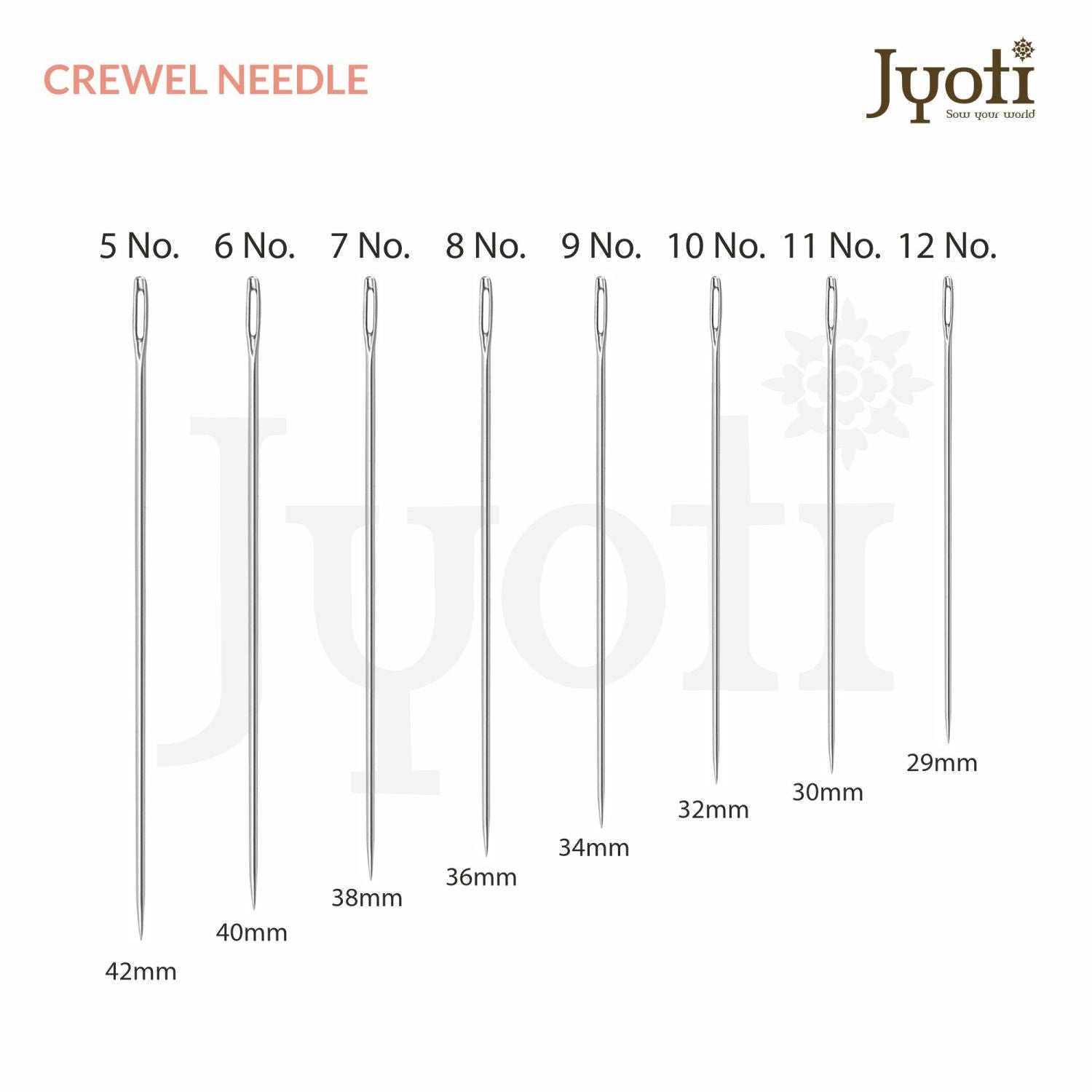 Crewel hand sewing needles, medium-length needles with elongated eye and sharp point. They are used for hand embroidery using floss. Embroidery needles are better for thread and wool because of their longer eye compared to regular pointed needles. They are also similar to pointed needles in terms of length, diameter, and point profile.