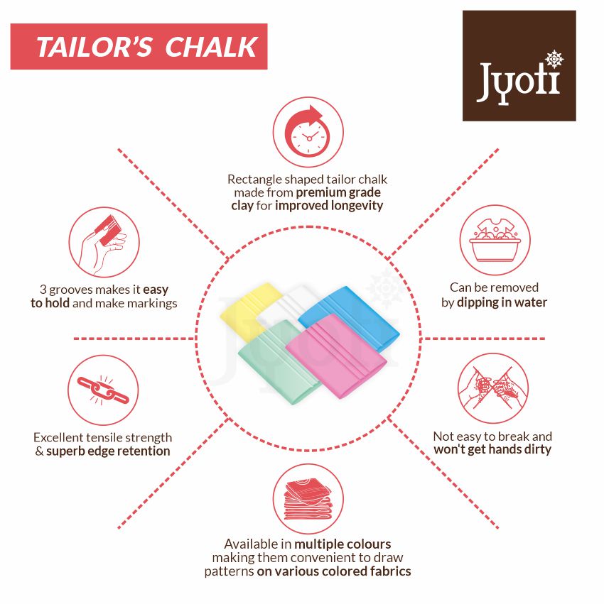 Tailors’ chalk. The heavy quality fabric marker for tailoring is made up of fine and superior quality. Sewing markers are easily erasable and ideal for sewing, tailoring, fashion designing, boutique, quilting, alteration, drafting stencil templates, drawing necklines while drafting patterns, etc.